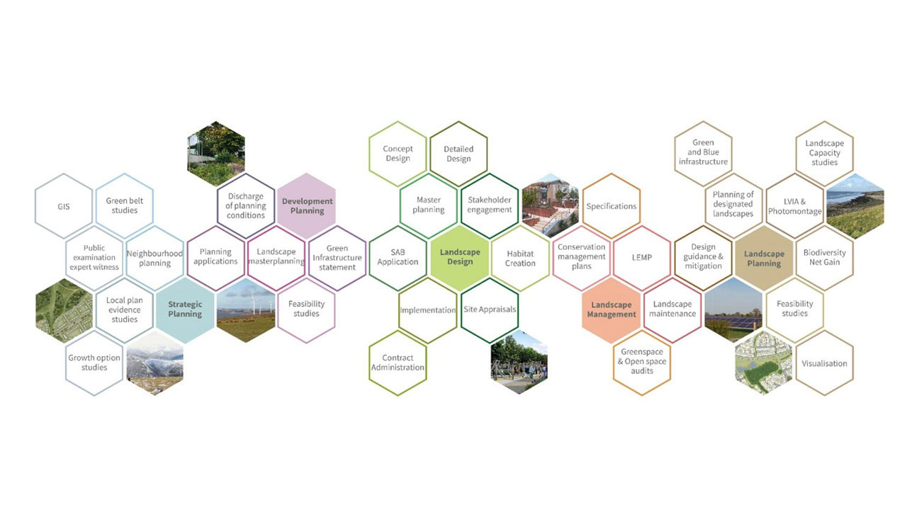 Our experience ranges from renewable energy schemes, town centre regeneration, residential schemes of all scales, to parks and open space projects. In addition to this, we deliver landscape architecture solutions for defence and security projects, business parks, commercial, mixed use, landscape restoration and industrial development.